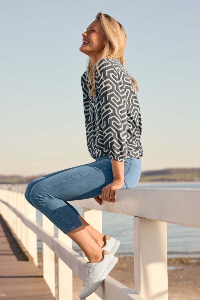 Tato halenka z jemně krepované viskózy je ideální pro dny, kdy chcete vypadat upraveně, ale cítit se naprosto volně. Má elegantní výstřih do V, který lichotí dekoltu, a vzdušné 3/4 rukávy s jemným nařasením a elastickým zakončením. Od velikosti 42 je navíc doplněna o prsní záševky, aby perfektně padla. Materiál z viskózy LENZING™ ECOVERO™ pochází z přírodních obnovitelných zdrojů. Moderní grafický potisk v tmavě zelené na krémovém podkladu působí svěže, ale zároveň nadčasově.