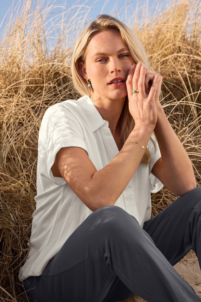 Díky viskóze s lehce krepovaným povrchem působí halenka vzdušně, ale zároveň se skvěle nosí. Košilový límec dodává elegantní vzhled. Kolekce umožňuje výběr z čisté krémově bílé pro milovnice minimalismu nebo z varianty s hravým grafickým potiskem.