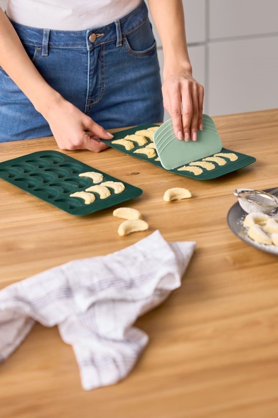 Vůně vanilky a ořechů se jemně prolíná v jednom z nejznámějších druhů cukroví – vanilkových rohlíčcích. Jejich chuť je nezaměnitelná, ale čas potřebný k vytvoření dokonale pravidelných tvarů může leckdy odradit. Se silikonovou formou stačí těsto jednoduše rozetřít do připravených formiček a výsledkem jsou krásně rovnoměrné rohlíčky. Součástí balení je i stěrka pro snadné rozetření těsta. Každá forma pojme šestnáct rohlíčků, takže práce jde rychle od ruky a ušetřený čas můžete věnovat odpočinku u vánočních pohádek.
