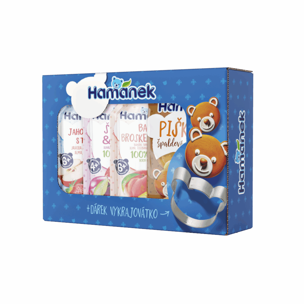 Vánoční multipack Hamánek obsahuje špaldové perníkové piškoty a dále tři ovocné kapsičky v oblíbených příchutích: jahoda s tvarohem, broskev a banán, švestka a jablko. Mimo chutné svačinky uvnitř najdete i vánoční vykrajovátko ve tvaru medvídka, které se skvěle hodí na společné pečení vánočního cukroví. Doporučená MOC: 99 Kč.