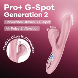 Satisfyer Pro+ G-Spot Generation 2 otevírá novou kapitolu dvojí rozkoše pro klitoris i bod G – a díky LCD displeji je vždycky snadný přehled o zvolených programech i stavu baterie. Obě části mají vlastní motory pro vzduchové pulzy i vibrace. Lze je ovládat zvlášť a jsou velmi tiché – takže je možné nenápadně vychutnávat jedinečné vlny rozkoše. Intuitivní ovládání 12 vibračních programů a 11 intenzit vzduchových pulzů pomůže najít přesně takovou míru stimulace, která sedne každé náladě i chuti.