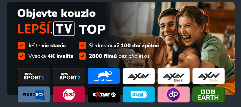 | Balíčky Lepší.TV MINI a KLASIK jsou skvělým vstupem do světa Lepší.TV, ale s balíčkem TOP posunete televizní zábavu na další úroveň! Užívejte si ještě více stanic, lepší kvalitu obrazu a vychutnejte si Lepší.TV opravdu na maximum. S balíčkem TOP získáte celkem 160+ stanic, sledování až 100 dní zpětně, ještě více filmů, seriálů a také sledování ve 4K rozlišení. To vše za 309 Kč měsíčně. |